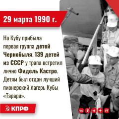 29 марта 1990 года первая группа из 139 детей Чернобыля прибыла на Кубу. У трапа самолета их встретил лично Фидель Кастро. Руководство Пионерской организации имени Хосе Марти выделило для детей из СССР лучший пионерлагерь Кубы «Тарара». Несмотря на тяжелую экономическую ситуацию в стране, Фидель Кастро заявил: «Помогать будем столько, сколько будет нужно».