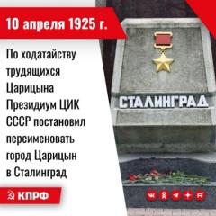 10 апреля 1925 года – ВЦИК постановил переименовать Царицын в Сталинград, а Царицынскую губернию – в Сталинградскую губернию в ознаменование заслуг И.В. Сталина как организатора обороны Царицына в 1918-1919 годах.