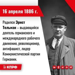 16 апреля 1886 года родился Эрнст Тельман – выдающийся деятель германского и международного рабочего движения, революционер, антифашист, лидер Коммунистической партии Германии.