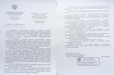 Более того, эти действия, как оказалось, абсолютно никак не согласованы с Министерством культуры РФ, которое занимается сохранением памятников исторического наследия по всей стране. Согласно информации, которую предоставило само министерство в ответ на запрос Брянского областного отделения КПРФ, для получения согласия на перенос памятника, в ведомство нужно предоставить целый перечень документов, но ни один из них Министерство культуры не получало.
