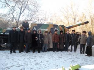 После возложения участники торжественной акции сфотографировались у танков военной поры, на башнях которых нанесены призывы «За Родину!» «За Сталина!».