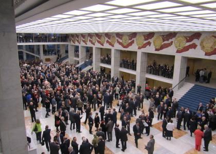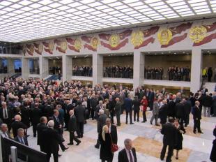 В этом году – 95-летие комсомола, и 6 тысяч человек собралось в Кремлёвском Дворце Съездов. В этом году билетов раздали явно больше, чем было мест, и борьба за эти билеты была дикая, и народ только что на люстрах не висел... В этот раз москвичей было меньше, чем обычно (что правильно), ибо страна наша велика и обильна, и пригласительные распределили по регионам. Региональные комсомольские братства и землячества начинали встречаться аж с часу дня:)) - в метро я наткнулась на сбор якутской делегации, на выходе из метро собиралась стайка людей в шарфиках "Комсомол Ярославской области", а у памятника Жукову стояли люди с картонкой "Сбор иркутских комсомольцев".