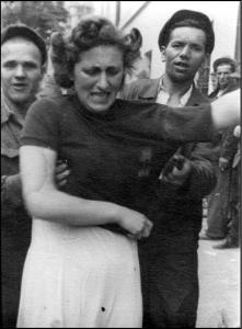 На фото - бандеровский милиционер с повязкой издевается над девушкой - её заставляют идти по улице на коленях и с поднятыми руками.