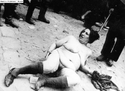По всей видимости, снова эта же женщина. Погромщик бьет её палкой. Молодой девушки, которую она прижимала к себе перед раздеванием - уже нет рядом.