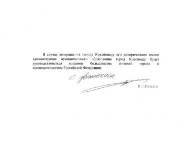В случае возвращения городу Краснодару его исторического имени администрация муниципального образования город Краснодар будет руководствоваться мнением большинства жителей города и законодательством Российской Федерации.