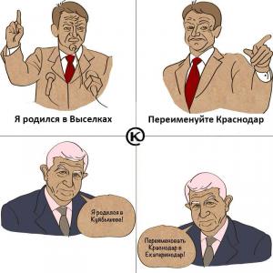 1.Является ли нынешнее название города Краснодар, как следует из смысла Вашего заявления для СМИ, "бесславным" и "негордым", так как Вы настаиваеге на его замене на имя "славное" и "гордое"?