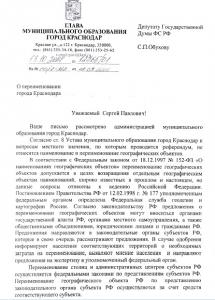 Когда у администрации Краснодара возник в 2008 году острый приступ желания замутить общественно-политическую ситуацию в городе и активизировались попытки переименования города в Екатеринодар, депутат Госдумы от Краснодара С.П.Обухов направил мэру В.Л.Евланову соответствующий запрос.