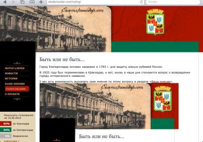 Кстати, когда С.П.Обухов в 2008 г. писал свой запрос на Интернет-ресурсе проекта Ekaterinodar.com, пропагандирующем, по сути, переименование Краснодара в Екатеринодар были представлены данные электронного голосования: на 18.09.2008 года за переименование высказалось меньшинство - 39% посетителей. Заметим, сегодня, 15.05.2014 г. доля сторонников переименования в Екатеринодар еще больше уменьшилась и составила лишь 34%. При этом 62% жителей столицы Кубани твердо высказываются за гордое и прекрасное название – Краснодар.