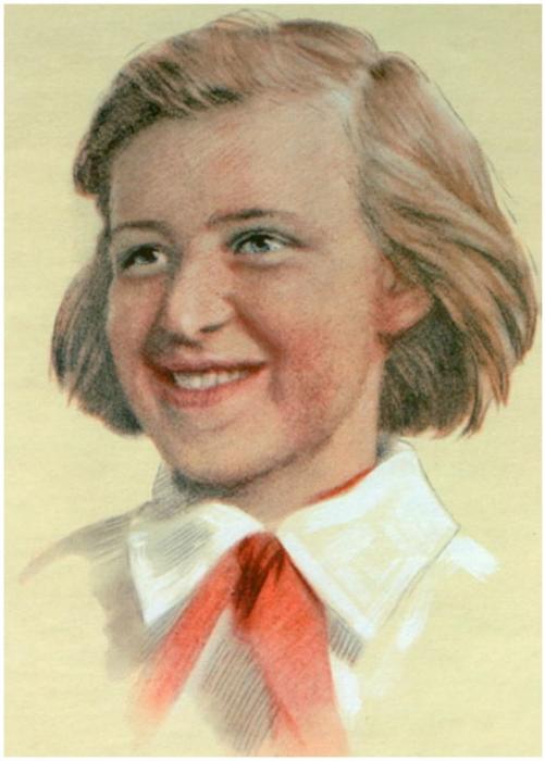 Куда бы ни шла синеглазая девочка Юта, ее красный галстук неизменно был с нею… Летом 1941 года приехала она из Ленинграда на каникулы в деревню под Псковом. Здесь настигла Юту грозная весть: война! Здесь увидела она врага. Юта стала помогать партизанам. Сначала была связной, потом разведчицей. Переодевшись мальчишкой-нищим, собирала по деревням сведения: где штаб фашистов, как охраняется, сколько пулеметов. Возвращаясь с задания, сразу повязывала красный галстук. И словно силы прибавлялись! Юта поддерживала усталых бойцов звонкой пионерской песней, рассказом о родном своем Ленинграде… И как же радовались все, как поздравляли партизаны Юту, когда пришло в отряд сообщение: блокада прорвана! Ленинград выстоял, Ленинград победил! В тот день и синие глаза Юты, и красный ее галстук сияли, как кажется, никогда. Но еще стонала под вражеским игом земля, и отряд вместе с частями Красной Армии ушел помогать партизанам Эстонии. В одном из боев - у эстонского хутора Ростов - Юта Бондаровская, маленькая героиня большой войны, пионерка, не расставшаяся со своим красным галстуком, пала смертью храбрых. Родина наградила свою героическую дочь посмертно медалью "Партизану Отечественной войны" 1 степени, орденом Отечественной войны 1 степени.