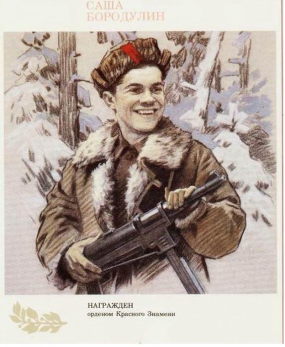Шла война. Над поселком, где жила Саша, надрывно гудели вражеские бомбардировщики. Родную землю топтал вражеский сапог. Не мог с этим мириться Саша Бородулин, пионер с горячим сердцем юного ленинца. Он решил бороться с фашистами. Раздобыл винтовку. Убив фашистского мотоциклиста, взял первый боевой трофей - настоящий немецкий автомат. День за днем вел он разведку. Не раз отправлялся на самые опасные задания. Немало уничтоженных машин и солдат было на его счету. За выполнение опасных заданий, за проявленное мужество, находчивость и смелость Саша Бородулин зимой 1941 года был награжден орденом Красного Знамени.