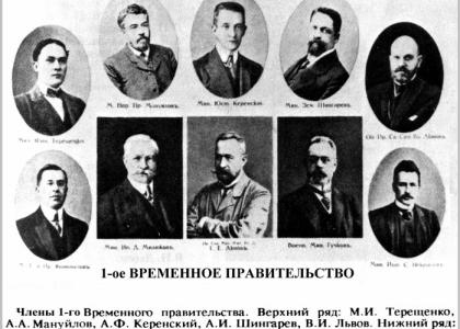 Задолго до Февральской революции в августе 1915 и апреля 1916 года на квартирах П.П. Рябушинского, С.Н. Прокоповича и Е.Д. Кусковой (все перечисленные лица - масоны) состоялись два совещания оппозиционеров. Решался важнейший вопрос: как распределить министерские посты после свержения царя. Практически все министры Временного правительства были предварительно утверждены именно на этих двух совещаниях, хотя это не значит, что все они принадлежали масонским ложам. В первом составе Временного правительства масонами были пять из двенадцати министров: Н.В. Некрасов, М.И. Терещенко, А.И. Коновалов, А.И. Шингарев, А.Ф. Керенский. Кроме них, на пост министра труда выдвигался масон Н.С. Чхеидзе, но он отказался от этого назначения. Заместителями министров (как тогда говорили, товарищами министров) также стали несколько масонов: Н.К. Волков, С.Д. Урусов, В.А. Виноградов, А. В. Ливеровский.