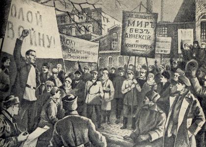 Заседание Русского бюро ЦК РСДРП(б): Из записок Александры Коллонтай: "Солнечный, весенний день. И настроение боевое, весеннее, полное смелого взлета надежд и напряжения воли. Утром — заседание бюро ЦК. В скромно-деловой редакции «Правды». Рассматривается и обсуждается письмо Ленина. Запомнилось единодушие. «Никакой поддержки Временному правительству», никаких «сговоров» с мелкобуржуазными партиями. Это в противовес ходкой в те дни формуле меньшевиков: «постольку — поскольку», то есть поддержка Временному правительству, хотя и с оговорками"
