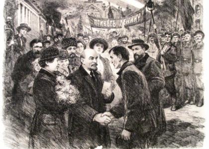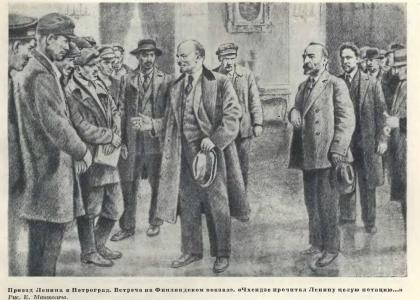 в 23:10 поезд с политэмигрантами прибывает на перрон Финляндского вокзала Петрограда, где Ленина встречает многотысячная толпа рабочих и солдат. От имени Петроградского Совета его приветствует Н.С.Чхеидзе.