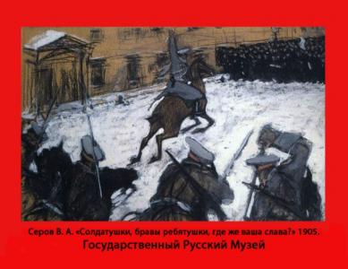 Помните картину Серова «Солдатушки, бравы ребятушки, где же ваша слава?»? На этой картине – то, что увидел художник из окна – русские кавалеристы, драгуны, ставшие предателями и карателями, как купленные Ельциным предатели-танкисты, расстреливавшие Верховный Совет России, убивали простых людей, отстаивавших своё право на жизнь…