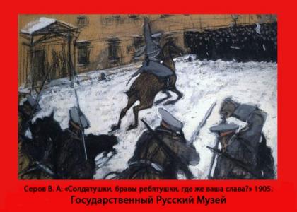 Помните картину Серова «Солдатушки, бравы ребятушки, где же ваша слава?»? На этой картине – то, что увидел художник из окна – русские кавалеристы, драгуны, ставшие предателями и карателями, как купленные Ельциным предатели-танкисты, расстреливавшие Верховный Совет России, убивали простых людей, отстаивавших своё право на жизнь…