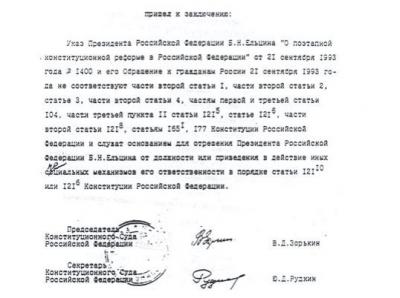 Спустя несколько часов Конституционный Суд под председательством В.Д.Зорькина принял Заключение о наличии оснований для отрешения Президента Б.Н. Ельцина от должности. А экстренно собранный Верховный Совет, а затем и съезд народных депутатов РСФСР отправили Ельцина в отставку и назначили и.о.президента тогдашнего вице-президента генерала Александра Руцкого.