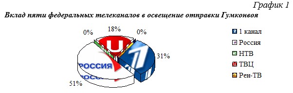 Больше всего времени освещению отправки Гумконвоя уделил телеканал «Россия» (51% или 5 минут 3 секунды). В эфир вышли высказывания Г.Зюганова, а также рядовых участников мероприятия. Так, телеканал выпустил в эфир цитаты лидера партии:
