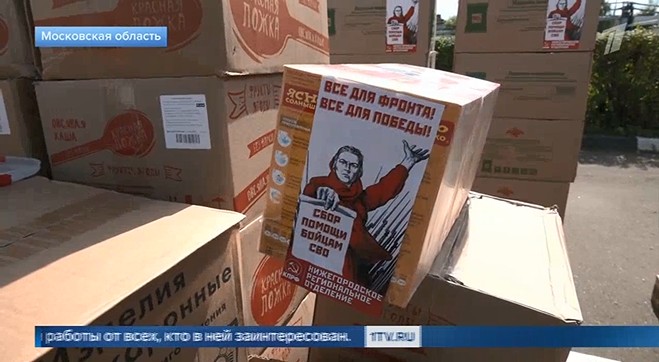 «Первый»: Это полноценный мощный конвой, который строго выполнен по заявкам ребят, защищающих русский мир, нашу свободу, независимость, нашу справедливость на фронте, где они борются против нацистов, фашистов, американских глобалистов и всей этой натовской сворой.