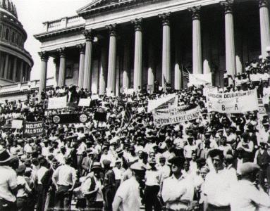 Летом 1932 года 25 тысяч безработных ветеранов (по другим данным – 30 тысяч) Первой мировой войны двинулись на Вашингтон. Они требовали выплаты ветеранских пособий. Среди участников марша было много сторонников левых. Но организаторы похода жестоко наказывали тех, кто вел "коммунистическую агитацию": 15 ударами солдатским ремнем по спине. Видимо, надеялись, что такое отношение к коммунистам предотвратит расправу над протестующими.