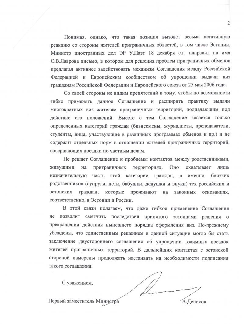В ответе МИД РФ за подписью заместителя министра Денисова говорится, что Министерство неоднократно, начиная с 2007 года, предлагало эстонской стороне подписать новое двустороннее соглашение об упрощении взаимных поездок жителей приграничных территорий, которое могло бы позволить, с одной стороны, сохранить для них льготный режим получения виз, а с другой - полностью учесть обязательства Эстонии как участницы Шенгенских соглашений. Однако эстонцы каждый раз отклоняли наши инициативы. В ходе контактов по линии внешнеполитических ведомств они ссылались на отрицательное отношение к такому соглашению со стороны МВД Эстонии.