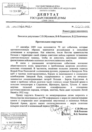 Государственная Дума в соответствии с протокольным поручением депутатов-коммунистов С.П.Обухова, В.Ф.Рашкина, В.Д.Хахичева обратилась в МИД РФ с запросом о мерах по увековечиванию памяти и сохранению мест захоронения замученных и казненных бойцов Красной Армии, других наших соотечественников - жертв политики польских властей в ХХ веке в период между двумя мировыми войнами. Можно считать, что данное решение, которое было принято на вечернем пленарном заседании Госдумы 18 сентября, является своеобразным ответом на намерение сейма Польши принять 23 сентября антироссийскую резолюцию, в которой события осени 1939 года квалифицируются, как «агрессия» и «геноцид» со стороны СССР по отношению к Польше.