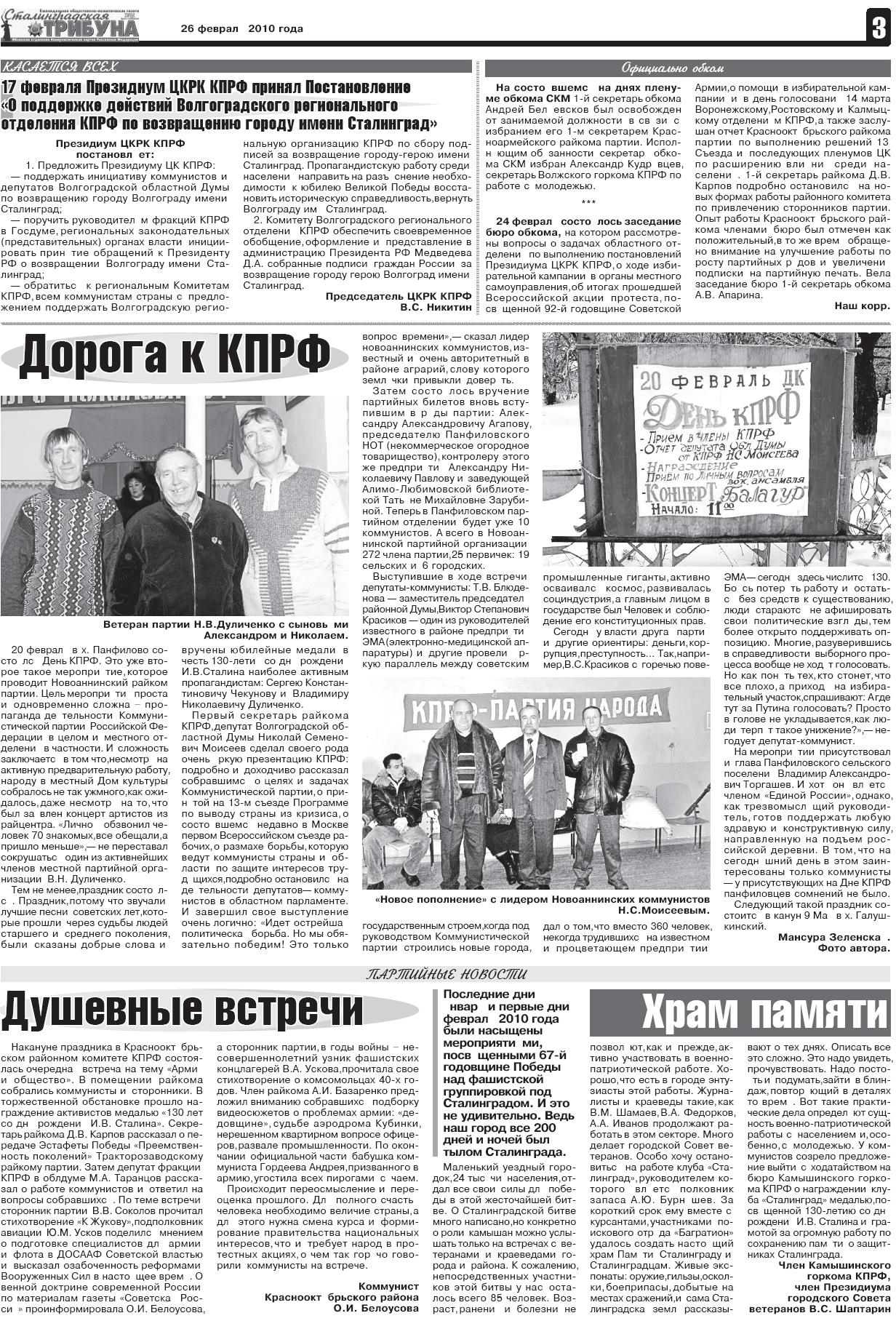 Газета рассказывает о том, как 23 февраля власть не пустила коммунистов и пришедших вместе с ними ветеранов, защитников Сталинграда на официальную церемонию к Вечному Огню. Делегация волгоградских коммунистов, в составе которой были уважаемые лица региона – защитники Сталинграда, участники Великой Отечественной войны, депутат Государственной Думы, лидер коммунистов области А.В. АПАРИНА, депутаты-коммунисты областной Думы, не смогла возложить венок к Вечному Огню на Аллее Героев вместе с представителями областной администрации.