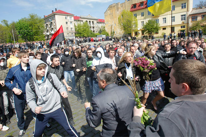 «Свободная пресса» уже писала, что через два дня после первого львовского погрома на согласительный совет собралась Верховная Рада. Именно тогда руководитель парламентской фракции Коммунистической партии П.Симоненко высказался за законодательный запрет националистических движений. Речь, прежде всего, о главной силе украинских неонацистов - ультрарадикальном объединении «Свобода», депутаты которого контролируют практически все местные советы Галичины. Верховодит этими крутыми хлопцами легендарный борец с «москалями, коммуняками и жидвой», а теперь и с «донецкой навалой» Олег Тягныбок.