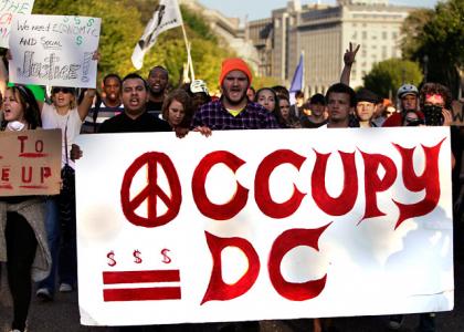 Шествие было мирным, во всяком случае, полиция не сообщала о задержаниях участников акции. Протестующие несли ставшие уже традиционными плакаты, требующие от властей призвать к ответственности финансовые корпорации, которые "пируют во время чумы" безработицы и растущего классового неравенства. Впрочем, некоторые участники марша смогли выделиться на фоне соседей. Один нес шест, на который, будто на кол, была "нанизана" фотография головы генерального директора банка Goldman Sachs Ллойда Бланкфэйна. Другой нес флаг США, на котором красные полосы были выполнены из крылатых ракет, а вместо звезд красовались логотипы крупнейших американских компаний. "Банки выкупили!" - выкрикивал "заводила". "Нас продали", - скандировала в ответ толпа.