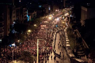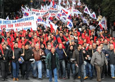 На крупном митинге, организованном ПАМЕ (Всерабочим Боевым Фронтом), ПАСИ (Всекрестьянским боевым сплочением), ПАСЕВЕ (Всегреческим антимонополистическим сплочением ремесленников и торговцев), ОГЕ (Федерацией Женщин Греции) и МАС (Фронтом борьбы студентов) преобладал лозунг: «Без тебя не движется производство. Рабочий, тебе не нужны хозяева.».