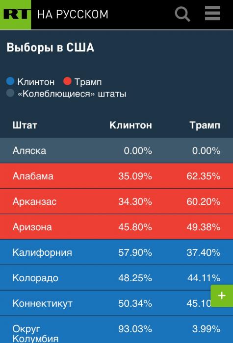 По предварительным прогнозам газеты The New York Times и телеканала CNN, Дональд Трамп набирает 197 голосов коллегии выборщиков, а Хиллари Клинтон — 131. Трамп в напряжённой борьбе отыграл лидерство в ключевых штатах Флорида и Техас.