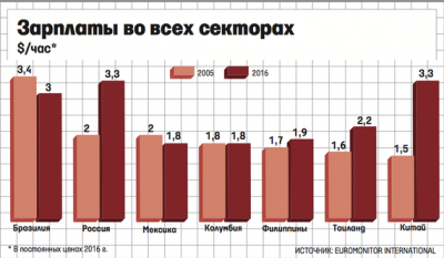 Средний уровень почасовой оплаты труды в производственном секторе Китая теперь выше, чем в Бразилии и Мексике, и быстро приближается к уровню Греции и Португалии. По данным Euromonitor International, в 2005-2016 гг. заработок китайских рабочих утроился до $3,6 в час. Если учитывать все секторы экономики, то зарплаты в Китае превосходят уровни всех крупных стран Латинской Америки, за исключением Чили, и достигают около 70% от уровня периферийных стран еврозоны.