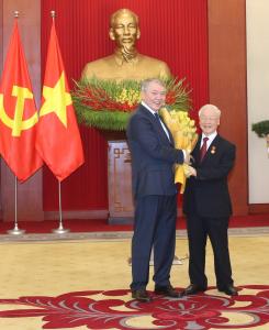 Вчера в Центральном комитете КПВ состоялась торжественная церемония вручения Ленинской премии ЦК КПРФ Генеральному секретарю ЦК Коммунистической партии Вьетнама товарищу Нгуену Фу Чонгу, присужденную ему за большой личный вклад в практику социалистического строительства и развитие коммунистического движения на современном этапе, многолетнюю деятельность по изучению и применению марксистско-ленинских философских знаний, научную разработку актуальных проблем социализма в качестве главного редактора журнала ЦК КПВ «Коммунист» и председателя Теоретической комиссии ЦК Компартии Вьетнама, за систематические усилия, направленные на укрепление отношений дружбы и братства между народами Вьетнама и России.