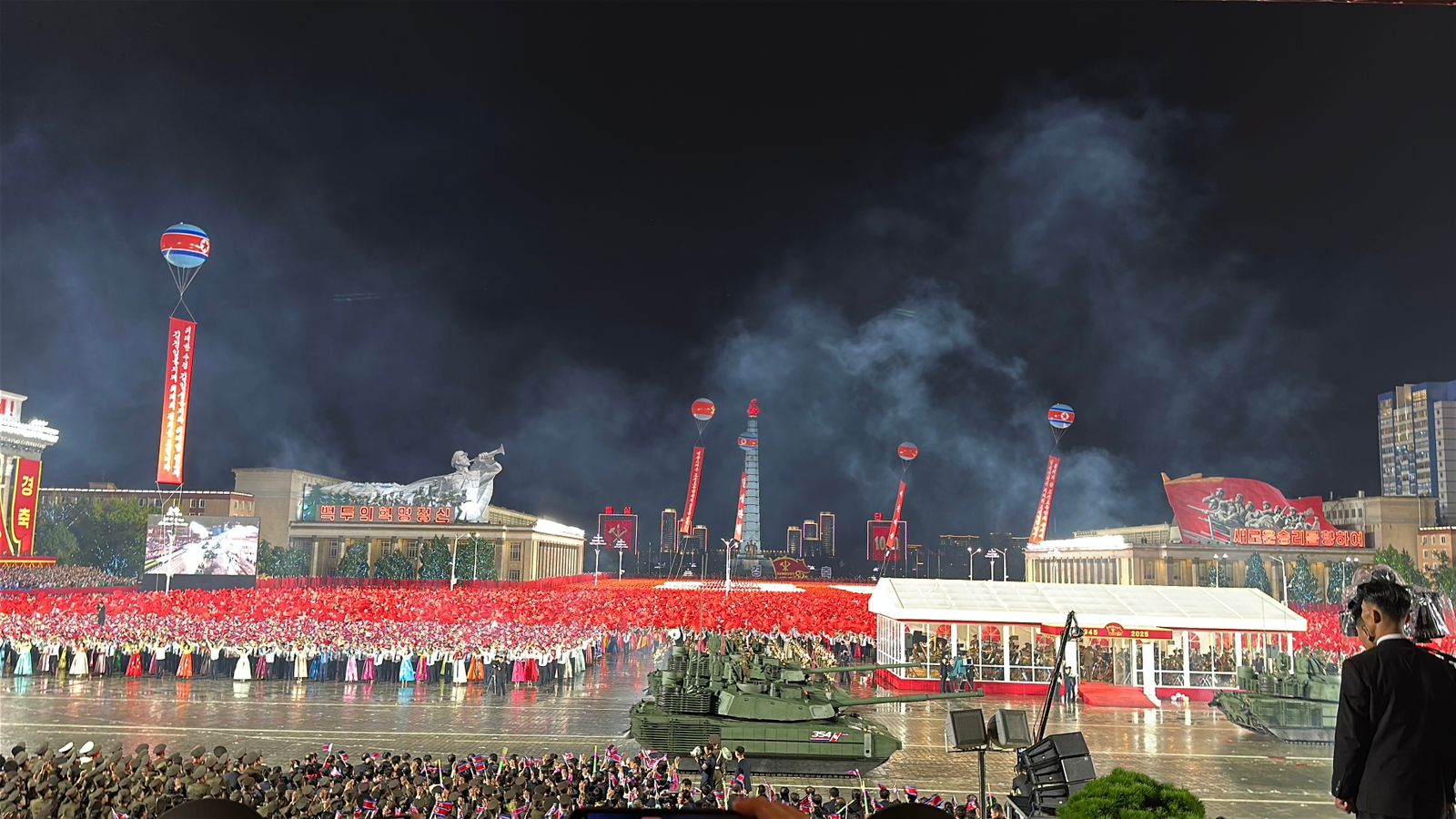После приема в центральной части Пхеньяна, на площади имени Ким Ир Сена состоялся грандиозный военный парад в честь праздника. На параде присутствовал Председатель Государственных дел КНДР товарищ Ким Чен Ын. На площади имени Ким Ир Сена собрались сотни тысяч людей. Во время парада было продемонстрировано большое количество самой современной военной техники, межконтинентальные баллистические ракеты нового поколения. Во время парада под песню «Служить России» торжественным маршем под двумя флагами – России и КНДР – прошли корейские бойцы, участвовавшие в СВО и плечом к плечу с российскими военнослужащими, освобождавшими Курскую область. Это самым ярким образом продемонстрировало, насколько крепка и прочна дружба между нашими государствами даже в самые тяжелые времена. Все остались в восторге от парада, продемонстрировавшего мощь КНДР и достижения корейского народа.
