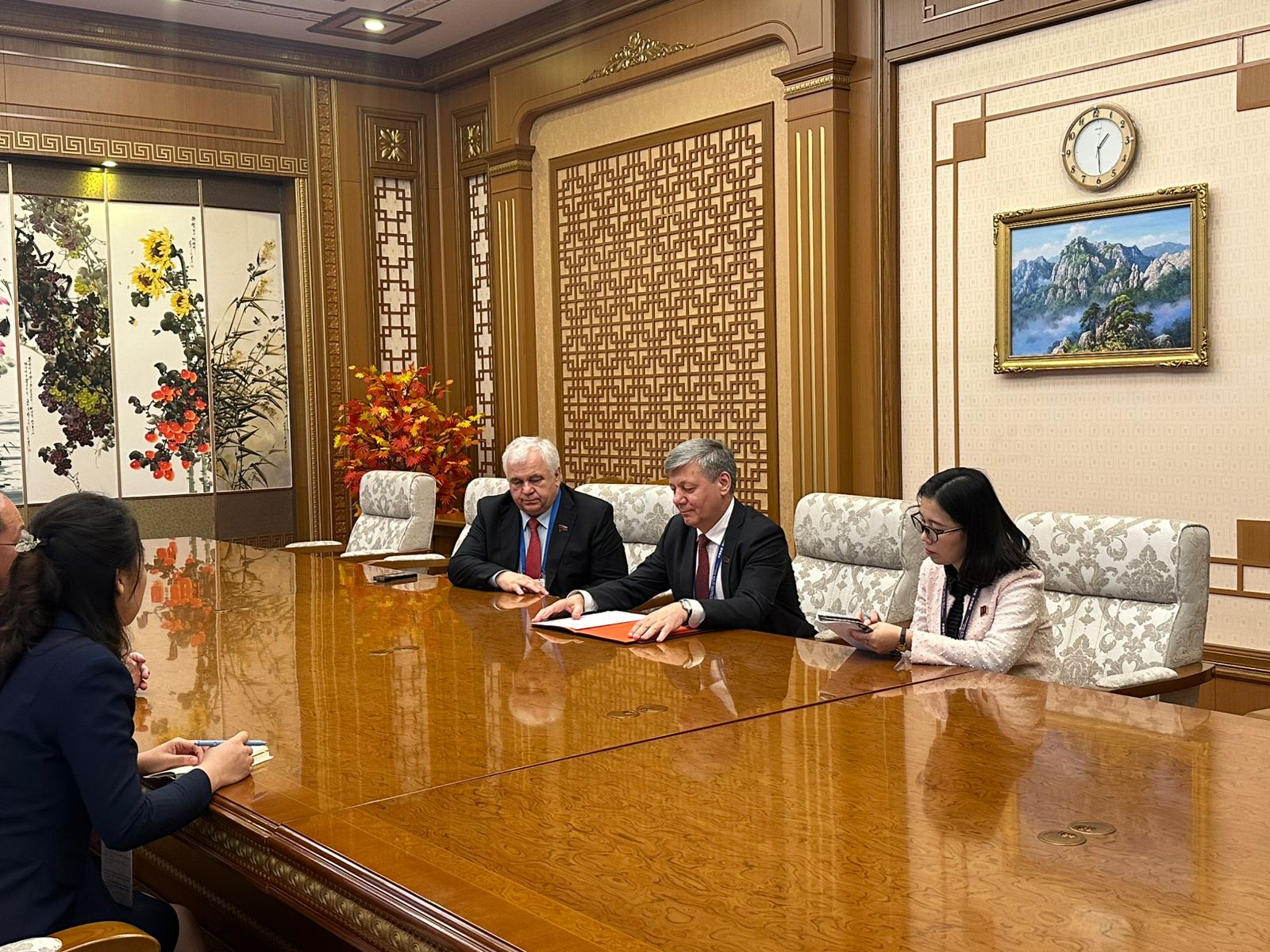 Затем прошла встреча члена Президиума ЦК КПРФ, Губернатора Орловской области А.Е. Клычкова с Председателем Народного комитета провинции Южный Хванхэ товарищем Ли Чхоль Маном. В повестке дня встречи по развитию межрегионального экономического и культурного сотрудничества – в ближайшее время планируется заключить официальное Соглашение о взаимодействии между Орловской областью и провинцией Южный Хванхэ. Стороны отметили, что существует большой потенциал для двустороннего сотрудничества по целому ряду направлений – в сфере торговли, науки, образования и культуры – и договорились продолжать активные контакты. Андрей Клычков пригласил товарища Ли Чхоль Мана посетить Орловскую область с официальным визитом. В конце встречи делегация вручила Председателю Партийного комитета подарки КПРФ и сувениры от Орловской области.