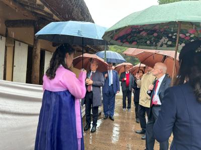 Утром 10 октября члены делегации направились в Мангёндэ и посетили дом-музей, где родился и провел свое детство основатель КНДР, Великий Вождь товарищ Ким Ир Сен. Внутри дома-музея представлены вещи, принадлежавшие Великому Вождю и членам его семьи, а также сельскохозяйственные орудия. Затем делегация посетила Музей Победы в Отечественной Освободительной войне (1950-1953 гг.).