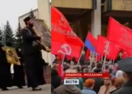 КОР: Живая цепь перед входом в парламент, и вот уже полиция, кажется, теряет контроль. Бывший президент и лидер компартии Воронин - тот редкий случай, когда и коммунисты, и священнослужители, чтобы не пустить на заседание депутатов, готовы вместе стоять насмерть.