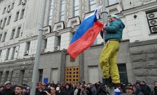 Одновременно российский флаг реет в столице Донбасса. Митингующие подошли к Донецкой обладминистрации, спустили с главного флагштока украинский прапор и подняли огромный триколор. Акция пророссийски настроенных дончан была по-настоящему массовая - до 50 тысяч человек! Милиция с трудом удерживает административные здания, прячась внутри от светошумовых гранат. Активисты говорят, что не хотят жертв среди силовиков. В толпе было много плакатов «Донбасс с Россией», «Беркут с народом, народ – с Беркутом», «Вставай, Донбасс».