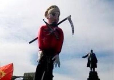 На фото: В Харькове у памятника Ленину вывесили куклу Тимошенко с косой смерти