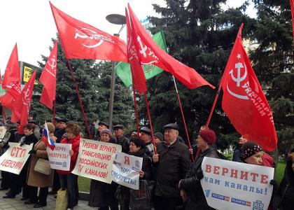 1 апреля коммунисты пикетировали офис Национального совета по вопросам телевидения и радиовещания в Харьковской области. Именно это ведомство подало иск в Киевский административный суд о приостановке трансляции российских телеканалов на Украине. И добилось своего. А поскольку достучаться до украинских телечиновников практически невозможно, протестующие прошествовали по центральным улицам под лозунгами: «Харьков — русский город!», «Мы хотим слышать Россию! Мы хотим видеть Россию!», «Требуем вернуть трансляцию российских каналов!», «Нет цензуре!».