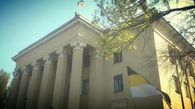 На здании канала развевается флаг Донецой Народной Республики.