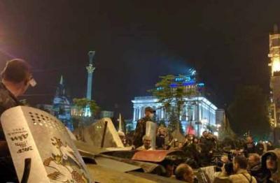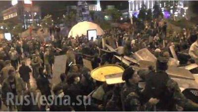 Толпа с факелами пыталась прорваться на Майдан и забрать себе реликвии, связанные с памятью "Небесной сотни". Их не пустили, на баррикадах началась жестокая драка между штурмовиками "Национал-социалистической Ассамблеи" и сотнями "Самообороны Майдана", сообщает портал "Русская весна".