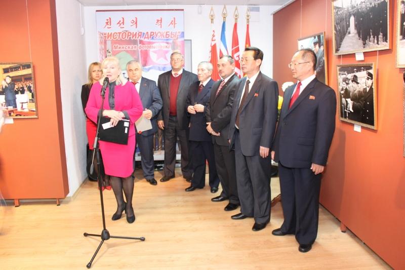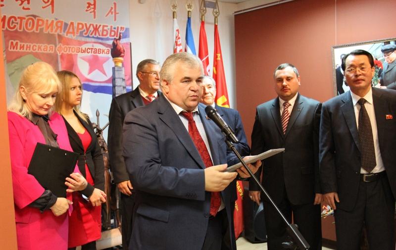 «Я приветствую всех товарищей, присутствующих в этом зале. Первый и второй этапы этой выставки прошли в Пхеньяне и в Москве. Выставка в Минске это третий этап международной выставки «История Дружбы», организованная Коммунистической партией Российской Федерации, Трудовой партией Кореи и Коммунистической партией Белоруссии.