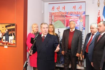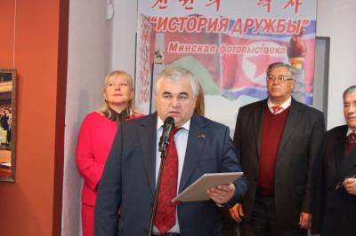«Я приветствую всех товарищей, присутствующих в этом зале. Первый и второй этапы этой выставки прошли в Пхеньяне и в Москве. Выставка в Минске это третий этап международной выставки «История Дружбы», организованная Коммунистической партией Российской Федерации, Трудовой партией Кореи и Коммунистической партией Белоруссии.