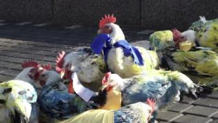 Корреспондент издания сообщил, что одесские активисты возле памятника Тарасу Шевченко выпустили несколько петухов и кур, раскрашенных в желто-голубые цвета и наряженных в ленточки с символикой националистической организации “Правый сектор”.