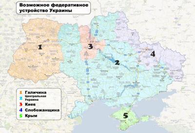 Один из старых проектов федерализации Украины, когда Крым был еще в составе Украины. (реализация такого проекта в теории могла предотвратить гражданскую войну и сохранить реальную территориальную целостность Украины). Ниже еще несколько примеров проектов федерализации.
