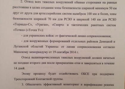 Достигнута договоренность об отводе тяжелых вооружений: для ВСУ - от линии нынешнего фронта, для ополчения - от линии 19 сентября. Не войск - а именно вооружений. Войска так и остаются неразделенными. То есть - повторение ситуации первого Минска.