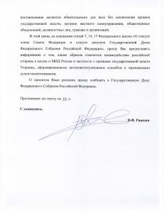 «Исходя из этого определения имевших место на Украине событий выстраивалась и выстраивается последовательная линия РФ на украинском направлении. При этом основной задачей российского руководства, органов исполнительной власти, включая, разумеется, МИД России, было и остается прежде всего отстаивание интересов РФ, защита прав наших соотечественников», — отметил глава МИД РФ в своем письме.