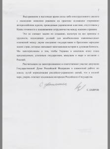 «Это не снимает задачи по созданию, несмотря на все препоны и трудности, подходящих условий для возобновления взаимовыгодных отношений между двумя соседними государствами и братскими народами наших стран, которые связывают многовековая история и духовная близость. Мы заинтересованы в том, чтобы Украина в конечном итоге стала предсказуемым успешным государством, живущим в мире и согласии с Россией», — говорится в письме.