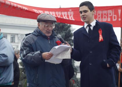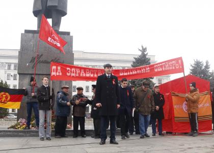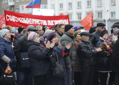 Уже с утра 7 ноября к памятнику В.И. Ленину, установленному на центральной площади Луганска, названной в честь Героев Великой Отечественной войны, стали стекаться местные жители и гости столицы ЛНР. Несмотря на военное положение, сотни жителей республики собрались здесь на праздничный митинг в честь 100-летия Великого Октября, организованный Компартией ЛНР, Союзом Коммунистов Луганщины, Союзом Советских Офицеров ЛНР и местным комсомолом.