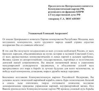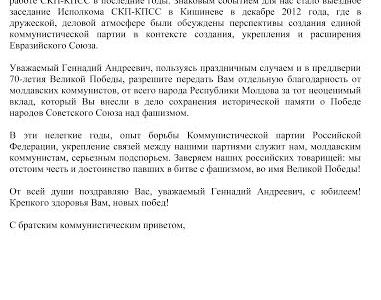 Уважаемый Геннадий Андреевич, пользуясь праздничным случаем и в преддверии 70-летия Великой Победы, разрешите передать Вам отдельную благодарность от молдавских коммунистов, от всего народа Республики Молдова за тот неоценимый вклад, который Вы внесли в дело сохранения исторической памяти о Победе народов Советского Союза над фашизмом.